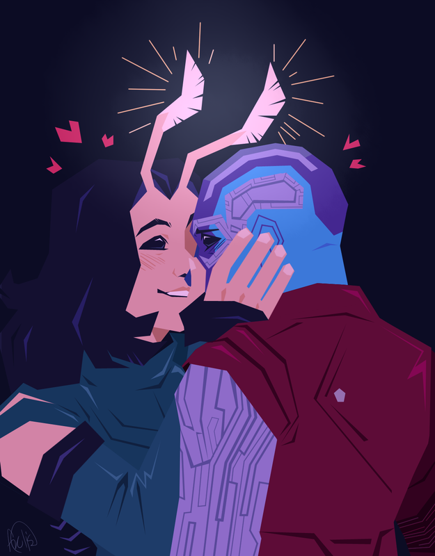 Nebula inhales sharply and for a brief instant Mantis can feel the spike of embarrassment and denial before she jolts back out of Mantis’s touch. Just before the connection is severed she catches a tiny glimpse of Nebula’s deeply buried affection and Mantis can’t help the breathy laugh that escapes her as she’s overcome with her own fondness.